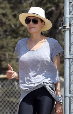 Енджи виглядала стильно в чорних джинсах-скинни, сірій футболці і кедах Nike. Образ актриси доповнив капелюшок і сонцезахисні окуляри.