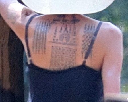 Під час зйомок Джолі вдалося сфотографувати зі спини, на якій, як бачимо, з'явилися три нові татуювання. Анджеліна любить прикрашати своє тіло тату у вигляді записів, виконаних арабською в'яззю. Найчастіше, це побажання миру, здоров'я, щастя і любові.