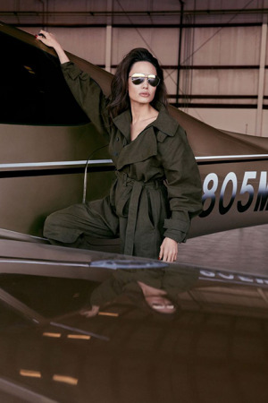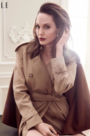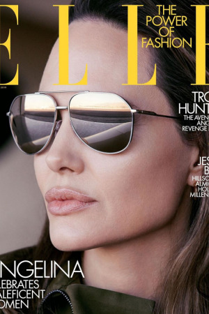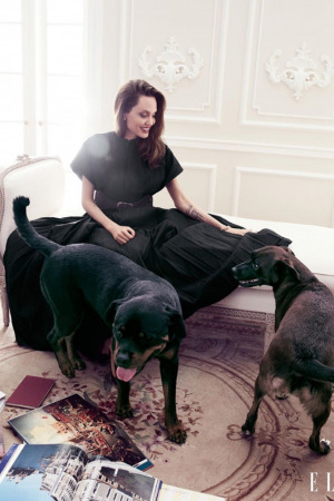 44-річна Анджеліна Джолі стала героїнею вересневого номера американського ELLE. На одних знімках Енджи позує в комбінезоні в стилі хакі і шкіряній куртці у великому ангарі на тлі літака, а на інших з'являється в розкішних інтер'єрах, гламурних нарядах і в компанії двох великих псів.