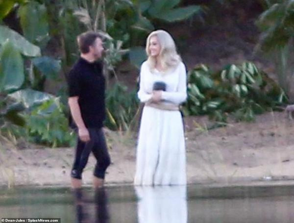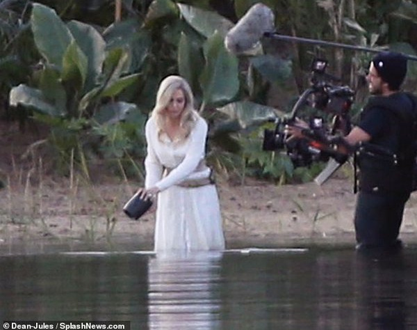 Спочатку вона знімається біля води, а потім заходить до пояса у воду.