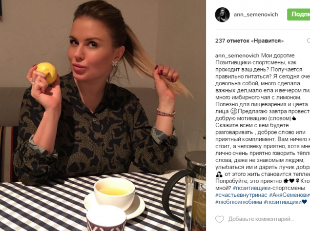 Ганна Семенович продовжує стежити за фігурою. Семенович опублікувала знімок, зроблений за обіднім столом.