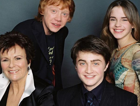 На знімках вона позує зі своїми колегами по знімальному майданчику, які зіграли Гаррі Поттера і Рона Уізлі.
