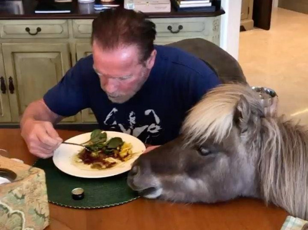 Не так давно Шварценеггер заявив, що планує дотримуватися самоізоляції, тому зараз він знаходиться вдома. Компанію йому склали незвичайні вихованці в особі осла і поні. Увагу Віскі і Лулу привернувв зелений лист салату на тарілці зірки "Термінатора", тому вони по черзі намагалися отримати ласощі. Сам актор не став відганяти тварин і охоче погодував їх зі своїх рук.