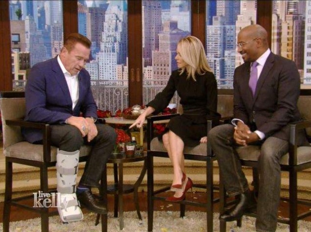 Голлівудський актор Арнольд Шварценеггер прийшов на шоу "Live with Kelly" в спеціальному медичному черевику. На програмі артист заявив, що від надмірного навантаження отримав пошкодження і там утворилася тріщина.