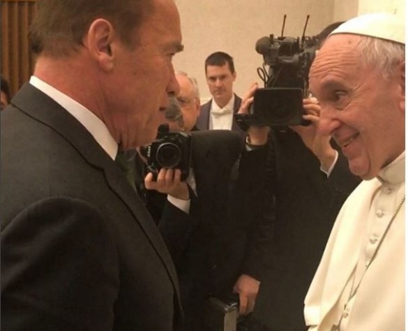 Популярний актор і екс-губернатор Каліфорнії Арнольд Шварценеггер зустрівся з Папою Римським Франциском у Ватикані.