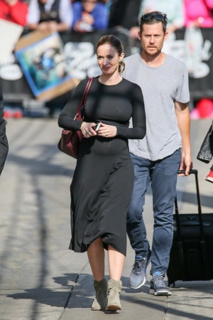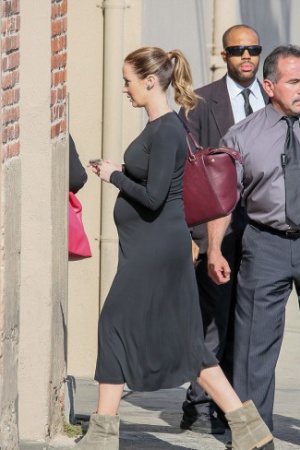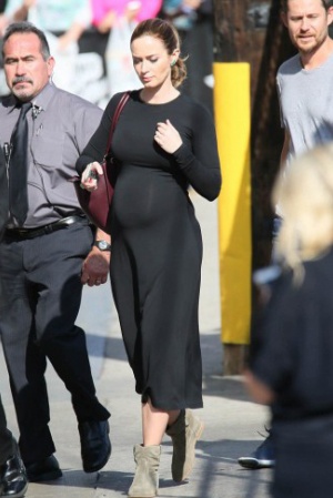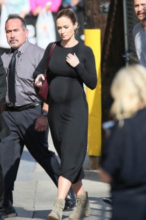 Голлівудська актриса Емілі Блант не зменшує темп навіть під час вагітності. Дівчина була помічена фотографами по дорозі в студію популярного вечірнього шоу Jimmy Kimmel Live. Емілі була одягнена в чорне біле плаття, яке вона доповнила бордовою сумкою і сірими замшевими напівчеревиками на плоскій підошві.