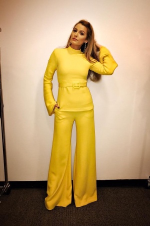 Так, з самого ранку знаменитість з'явилася на зйомках шоу "Good Morning America" в яскраво-жовтому косюмах від Brandon Maxwell.