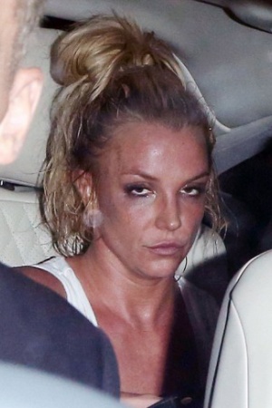 На знімках папарацці Брітні відображена в своїй машині, її волосся зібране в пучок, а макіяж розмазаний по обличчю. Жінці ледь вдається тримати очі відкритими.