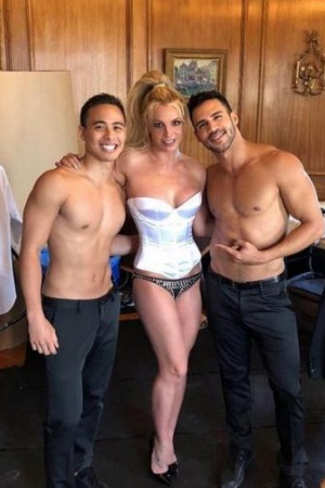 Брітні Спірс зараз зайнята зйомками для нового кліпу. Проте в перервах вона не втомлюється робити знімки, які примушують прихильників чекати виходу кліпу ще сильніше. Наприклад, остання публікація Брітні Спірс, де вона позує у білому корсеті поряд з двома напівголими танцюристами.