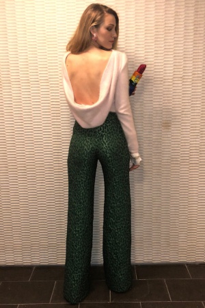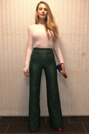 Під час недавніх відвідин вечірки художниці Ешлі Лонгшор Блейк вибрала стильні штани кльош зеленого кольору з твариною прийнятому, світлий светр з вражаючим розрізом на спині, а весь свій образ актриса доповнила яскраво-червоними туфлями-човниками на високих підборах. Виглядало дійсно яскраво і незвично!