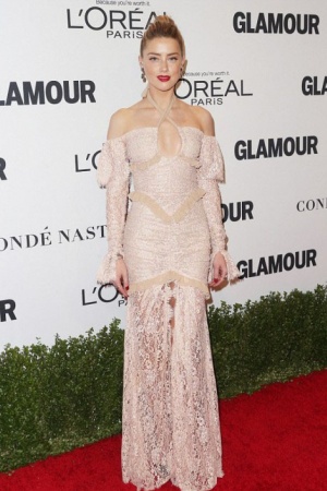 Сексуальна Херд блищала в оригінальній сукні з мереживом, рюшами і пікантним вирізом в зоні декольте. Свій образ Ембер доповнила червоною помадою, модним пучком і прикрасами від Kimberly McDonald.