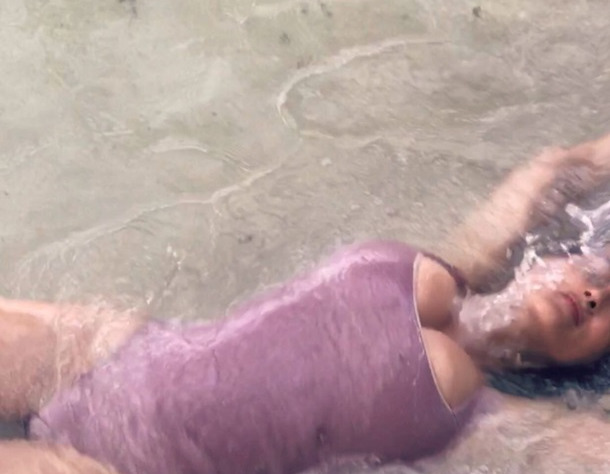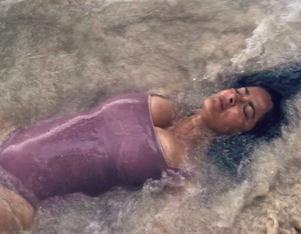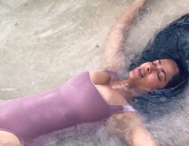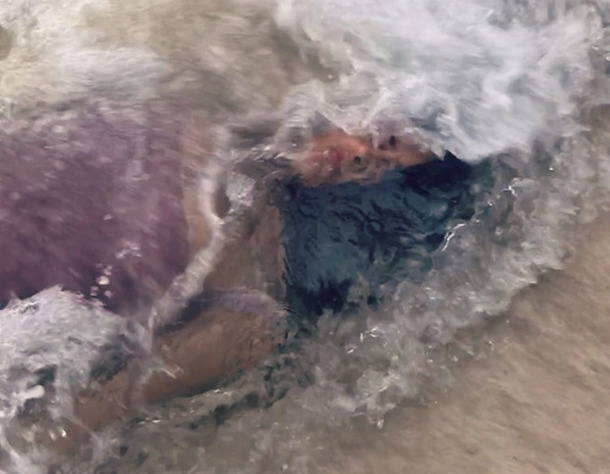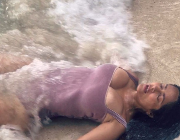 Актриса ніби дозволила хвилям себе затягувати у воду і витягувати на берег, а в цей час її знімали. На деяких кадрах зірку повністю покривають хвилі.