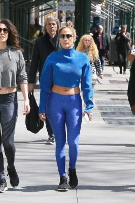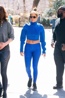 Так, 28 березня, папрарацці помітили знаменитість на одній з вулиць Нью-Йорка. Для прогулянки Лопес вибрала яскраво-сині спортивні легінси з ефектом шкіри рептилії і доповнила їх кроп-топом з високим горлом схожого відтінку. До монохромного образу вона підібрала великі окуляри-авіатори і чорні кросовки Nike.