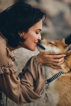 Співачка позує з нареченим Артемом Кімом, а також їх собачкою породи сіба-іну.