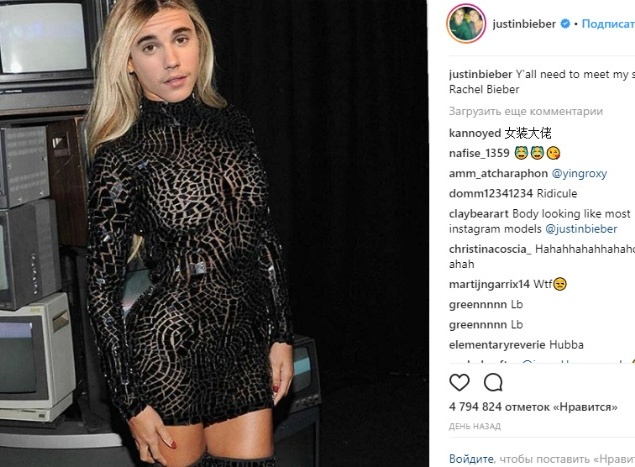 Так, на особистій сторінці в Instagram Бібер поділився провокаційним кадром з прихильниками. У кадрі виконавець з'явився в леопардовій сукні, ботфортах з довгим білявим волоссям і червоним манікюром.
