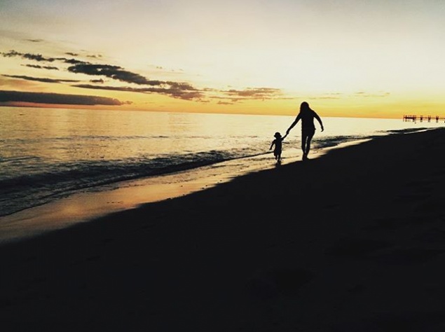 На фото Джессіка Біл зображена з сином Сайласом на березі океану. Вона міцно тримає його за руку і разом вони, судячи з усього, дуже щасливі.