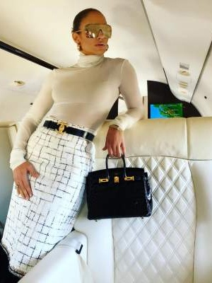 Для поїздки Джей Ло віддала перевагу спідниці-олівцю з твіду і водолазці. Свій образ вона доповнила поясом від Chanel і сумкою зі зміїної шкіри Hermès.