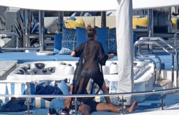 Під час прогулянки палубою яхти, зірка накинула на себе чорний прозорий халат.