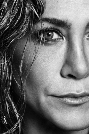 На обкладинку потрапив знімок зірки, на якому вона позує в шкіряній куртці на голе тіло, трусиках з високою талією і високих чоботях. При цьому Еністон сидить на столі і широко розвела ноги в сторони.