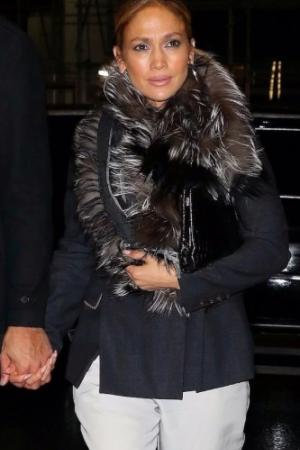 Для виходу Дженніфер одягнула хутряний шарф на теплий жакет, світлі зручні штани та сірі замшеві ботильйони на підборах.