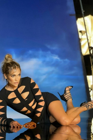 Для сьемки Джей Ло наділа коротку чорну сукню з численними вирізами.