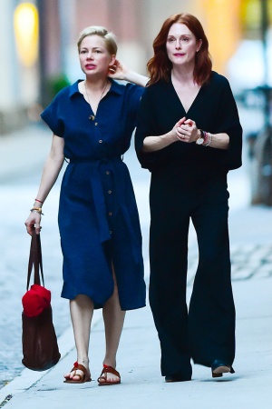 Актриса вже помітили на зйомках в Нью-Йорку: Мур з незмінною копицею мідного волосся з'являється в кадрі в чорному комбінезоні, а Мішель з короткою стрижкою складає їй компанію в синій сукні-сорочці.