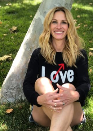 Робертс, навпаки, почала вісті свій блог у більше неформальній манері. У вівторок зірка виклала першу фотографію, на якій запечтлен, мабуть, один з днів відпочинку актриси. Джулія, одягнена у светр з написом Love ("Любов") і короткі шорти, насолоджується вільним часом на природі, сидячи на травичці в тіні дерева.