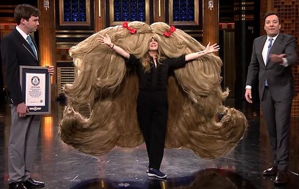 Американська актриса Дрю Беррімор взяла участь у популярному проекті Джиммі Фэллона The Tonight Show, в рамках якого приміряла двометрову перуку і встановила три рекорди Гіннеса.