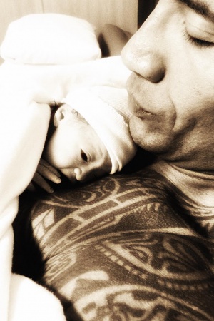 На знімку Дуейн зображений разом з новонародженою дівчинкою, якій дали ім'я Жасмін. Дуейн зізнався, що у нього і Лорен цього року Різдво настало раніше, адже народження доньки створило ще більш святкову атмосферу. Актор подякував шанувальникам за вітання і відзначив, що, коли маля лежить у нього на животі – це неймовірне щастя і почуття.