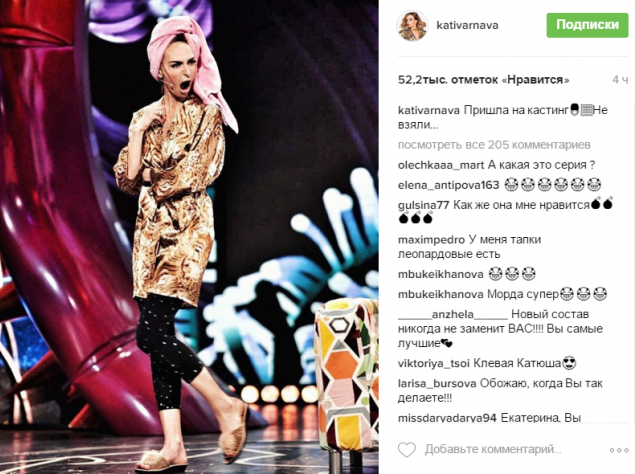 Катерина Варнава опублікувала фото, зроблене під час зйомок. Дівчину сфотографували на сцені в той момент, коли по ролі вона була в халаті, кімнатних тапочках і з рушником на голові.