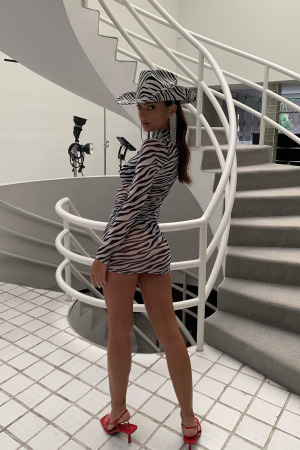 Зірка поділилася кількома фотографіями, на яких позує в супер короткій сукні в принт зебри, капелюсі до тону і рожевих босоніжках на підборах. Модель лежить на шкіряному дивані, він стоїть в порожній кімнаті.