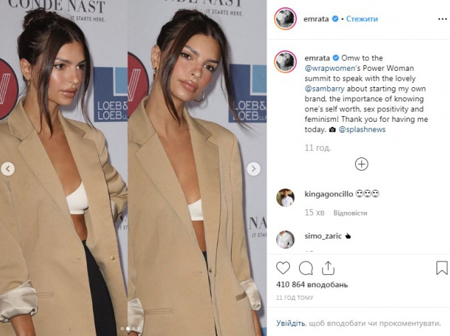 Модель не застебнула піджак, тому був помітний маленький білий топ-бюстгальтер, що ледве прикриває груди зірки.