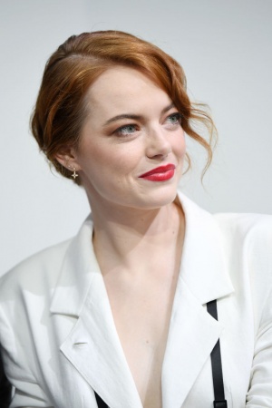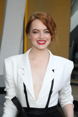 Для виходу на червону доріжку Стоун вибрала незвичайний чорно-білий костюм в ретро-стиле від Louis Vuitton. Верх наряду складався з білого укороченого піджака з плечима і глибоким декольте, а низ - чорні брюки-банани. Завершував образ ремінь на талії з логотипом Louis Vuitton. А за допомогою червоної помади і елегантного укладання актриса стала схожа на справжню француженку.