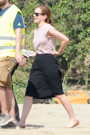 Емма Уотсон в даний момент знаходиться на зйомках фантастичного бойовика "Сфера" в Каліфорнії. 25-річна актриса була в піднесеному настрої, коли прогулювалася в перервах між дублями з членом знімальної групи в Филморе, США.