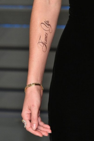 Ні вечірня сукня, ні прикраса не змогли відвернути увагу від татуювання на руці Еми. На підтримку акції проти сексуального насильства вона зробила тату із слоганом, який звучить "Time' s up", тільки на її руці напис був з граматичною помилкою - без апострофа. Добре хоч це не справжнє татуювання, а тимчасове.