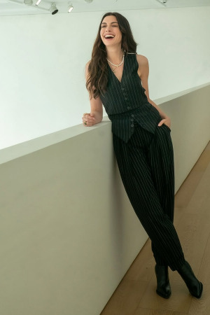 На особистій сторінці в Instagram акторка поділилася світлиною, на якій позує у чорному костюмі в смужку, що складається зі штанів і жилетки. Свій образ Гетевей доповнила черевиками з гострим носком і аксесуарами.