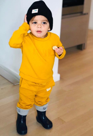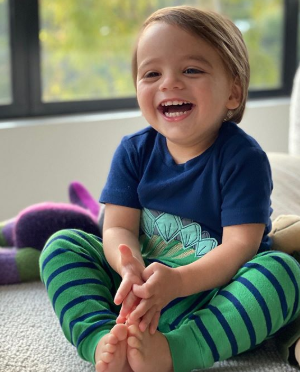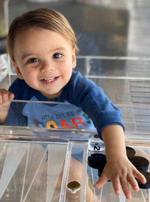 Лонгорія із сім'єю дотримується карантину та перебуває на ізоляції, тому її малюк позує вдома. Сантьяго зображений на дивані серед своїх іграшок. Компанію хлопчику складає домашній улюбленець – французький бульдог. Син акторки одягнений в кумедний костюм із смугастим принтом синьо-зеленого кольору. На світлинах видно його неймовірно красиву усмішку.