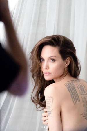 Днями з'явилися знімки, які робили за кадром відвертої фотосесії. На фото видно, як артистка позує, демонструючи усі свої татуювання на спині, і прикриваючи груди. Зірці зробили красиве укладання. На фото Анджеліна посміхається або серйозно дивиться в камеру. В цей час коштують люди, які її знімають.