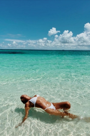 35-річна Шейк позувала у білосніжному бікіні, лежачи на воді і погойдуючись на хвилях на блакитному пляжі.