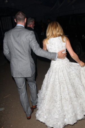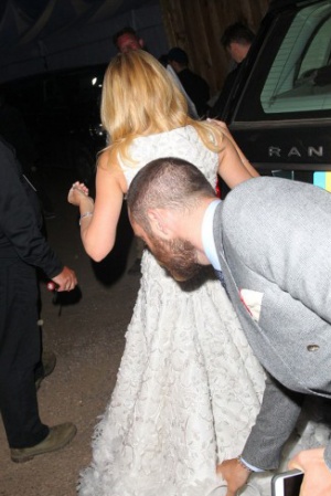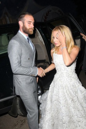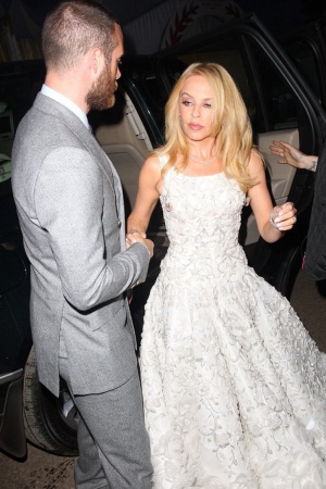 Наречений Кайлі був дуже турботливий: він допоміг своїй коханій вийти з машини, а коли сукня співачки втратила форму, розправив складки на подолі, щоб Кайлі виглядала бездоганно.