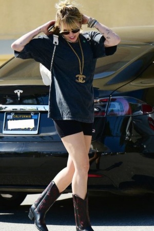 Співачка виглядала якось дивно і була схожа на рок-зірку. Одягнена Майлі була в чорні велосипедки і довгу чорну футболку, на шиї у неї висів золотий ланцюг з логотипом Chanel, за плечима був білий рюкзак, а в якості взуття в такий спекотний день Майлі наділа високі шкіряні чоботи на каблуках.