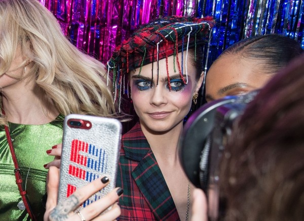 Для заходу 25-річна зірка фільму "Валеріан і місто тисячі планет" вибрала стильний комбінезон в клітку з вельми сміливими вирізами. Однак, не відвертий костюм привернув увагу публіки, а яскравий і незвичайний макіяж Кари Делевінь.