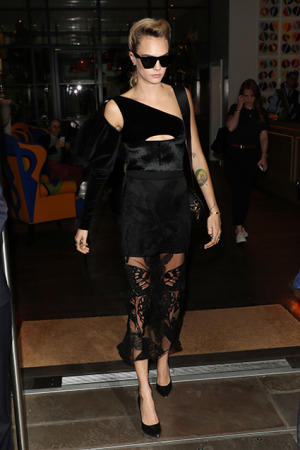 Наряд Кари цілком підійшов би і для червоної килимової доріжки - зірка була одягнена в чорну асиметричну сукню з мереживною обробкою і класичні човники. Доповнила свій образ Делевінь сонцезахисними окулярами, які завдяки своїй геометрії гармоніювали з її нарядом.