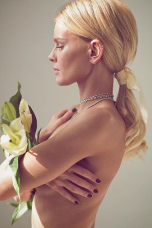 Свої груди Катя прикрила букет із лілією. У кадрі Кузнецова постає з макіяжем у стилі nude і з мінімалістичними прикрасами.