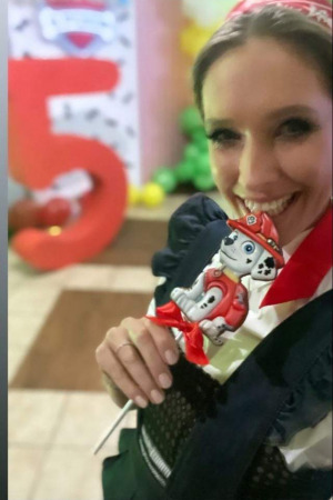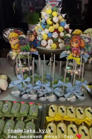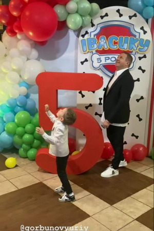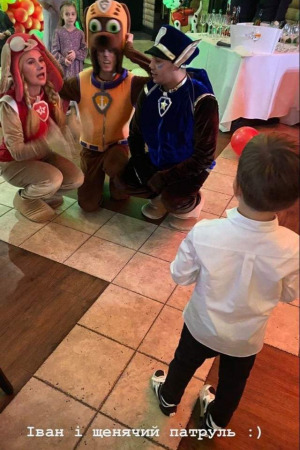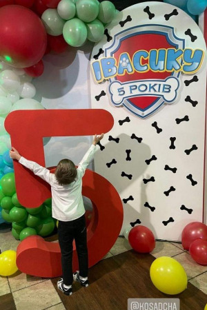 Шоумен та ведуча організували святкування у стилі улюбленого мультсеріалу Івана – "Щенячий патруль". Зала була прикрашена стилізованою фотозоною з написом "Івасику – 5" та кульками.