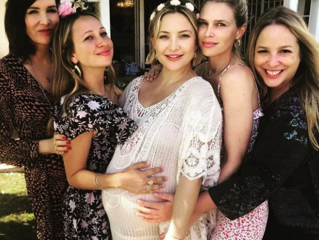 Зоряна мама Кейт Хадсон наділа миловидну білу сукню з мереживом, яке підкреслювало її живіт, що округлявся, а на голові розмістила ніжний вінок з кольорів. Люблячі подруги наділи сукні з різними принтами і обіймали кіноактрису.