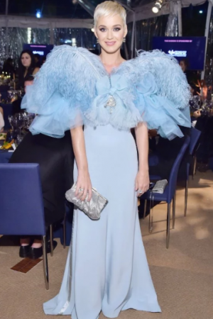 Цього разу співачка відкинула епатажність на задній план та відвідала гала-вечір amfAR у Лос-Анджелесі у сукні небесного кольору. Перед камерами селебріті постала в ефектному образі, який доповнила пір'ям, фатином та дорогоцінними прикрасами.