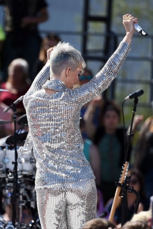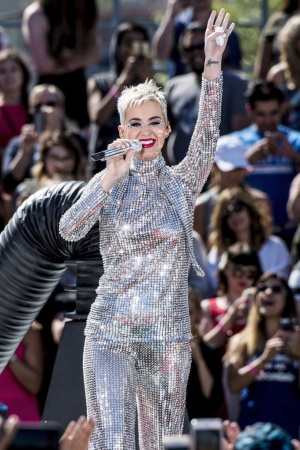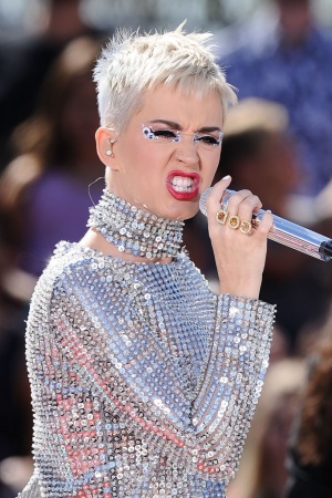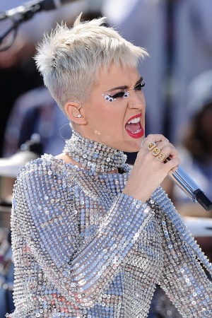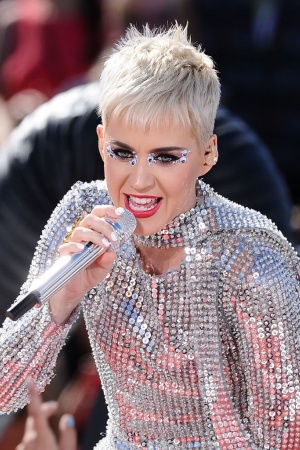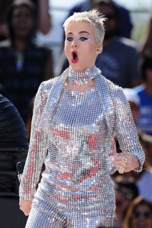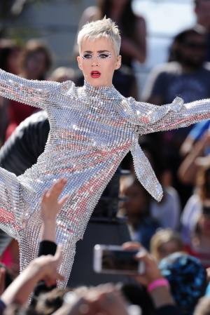 Так, на сцені артиста з'явилася зі стрижкою "під хлопчика", а волосся перефарбувала в платиновий колір. Не менш яскравим виявився і костюм Кеті: сріблястий комбінезон, повністю всипаний блискітками, не залишився непоміченим. Свій епатажний образ Перрі доповнила незвичайним макіяжем - яскраві губи, "смокі-айс" і багато-багато блискіток.