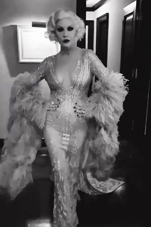 Позувала Кетрін в ефектній вечірній сукні по фігурі з шлейфом, глибоким декольте, блискітками і пір'ям. Образ актриси доповнив яскравий макіяж і перука з коротким світлим волоссям.