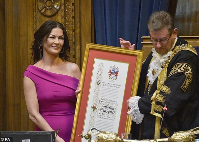 Зірка разом з 18-річним сином Диланом і 74-річним чоловіком Майклом Дугласом побувала в Уельсі, де вона відвідала урочисту церемонію в ратуші міста Суонси. У рідному місті зірці кіно вручили почесну нагороду Honorary Freedom of the City and County of Swansea.